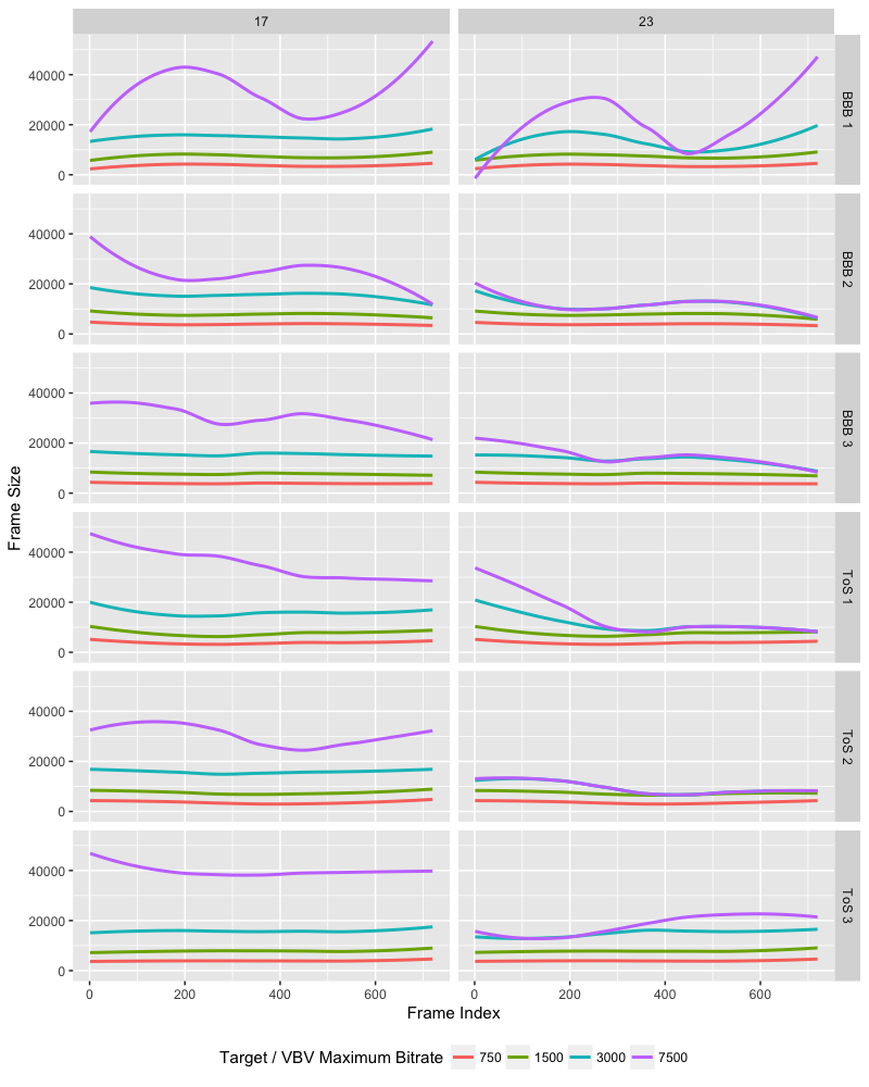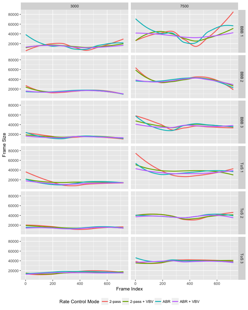 Let’s start with the different bitrate control modes. The left column is for 3000 kbit/s, the right for 7500 kbit/s. I excluded the other target bitrates since they did not show strong differences in the graphs, since the bitrate is already at such a low point that the encoder does not have a lot of choices on how to assign it. The rows are the different clips from Big Buck Bunny (BBB) and Tears of Steel (ToS). The line represents a LOESS smoothing over the individual frame sizes—it’s an indication of how the bitrate changes over the clip’s duration.